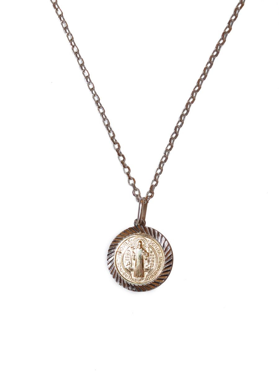 This sterling silver and gold plated St. Benedict medal measures .75" across and rests on a delicate 20" sterling silver rolo chain with a spring ring clasp.