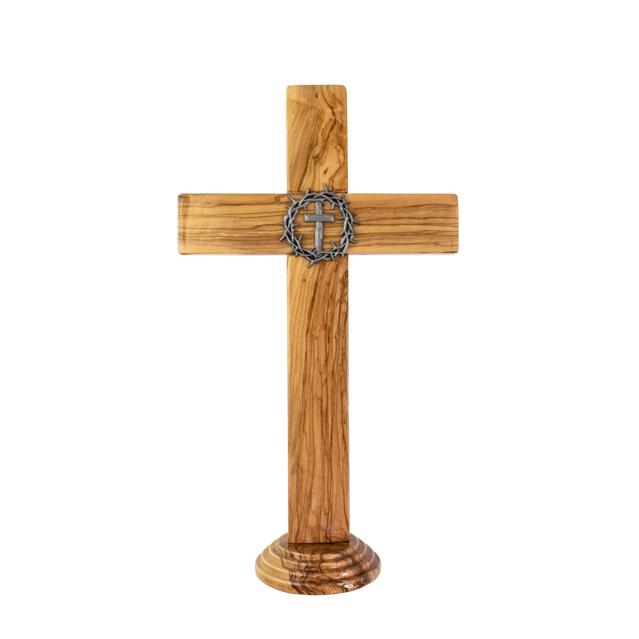 These Olive Wood Desk Crosses are made from locally grown and sustainably harvested olive trees in the Holy Land. The center of the wall cross features a sculpted metal crown of thorns. Put it on any table, desk, or altar, at church, home, or work to serve as a reminder of your faith. Due to the natural variations in olive wood, each individual cross is completely unique.