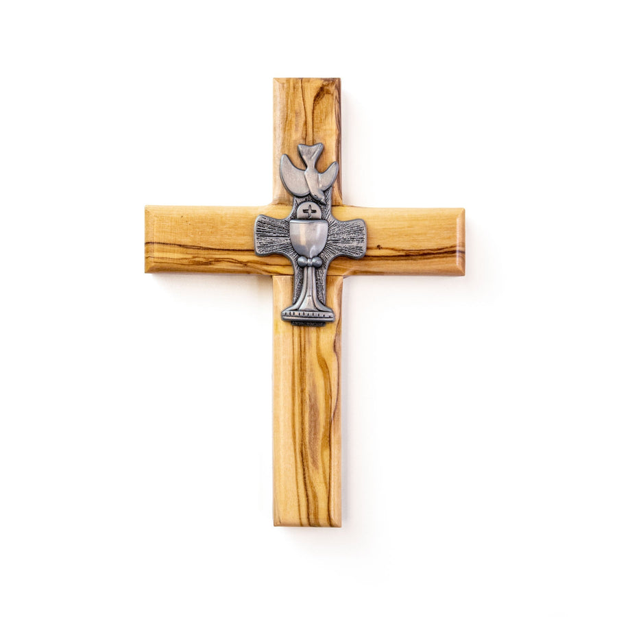 These Olive Wood Crosses are made from locally grown and sustainably harvested olive trees in the Holy Land. The center of the cross features a sculpted metal communion chalice and dove. Each cross comes packaged in a deluxe gift-ready box with a paper liner and a clear lid.