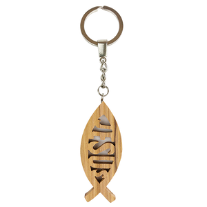 This keychain features a 2.5" certified olive wood fish charm, with the word "Jesus" in the middle. Keep this token with you as a reminder of where your strength comes from and who you represent.