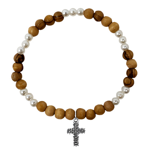 Olive Wood/Pearl Stretch Bracelet With Cross Charm