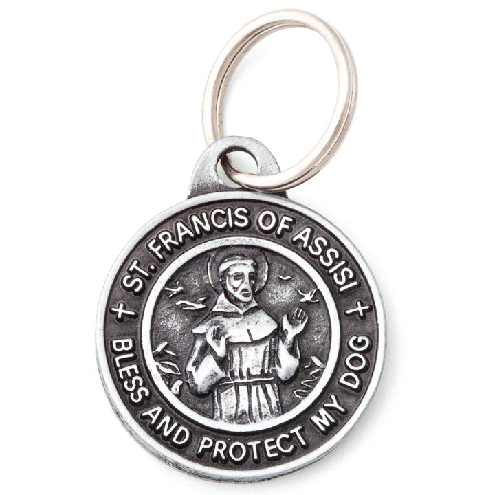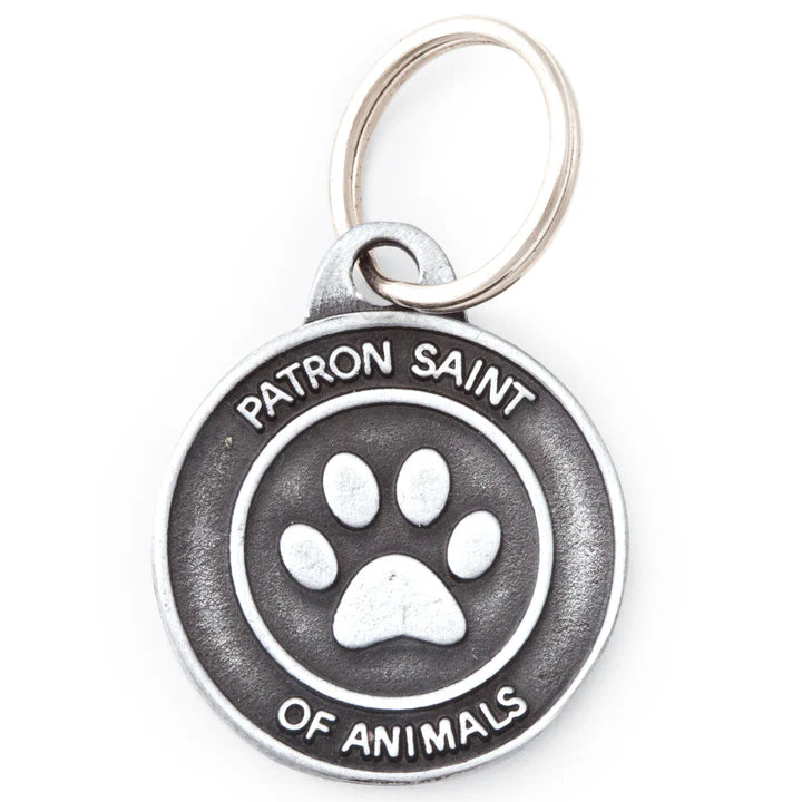 One side has an image of St. Francis and says, “St. Francis of Assisi bless and protect my dog.” The other side of the tag features a paw and says, “Patron saint of animals.”