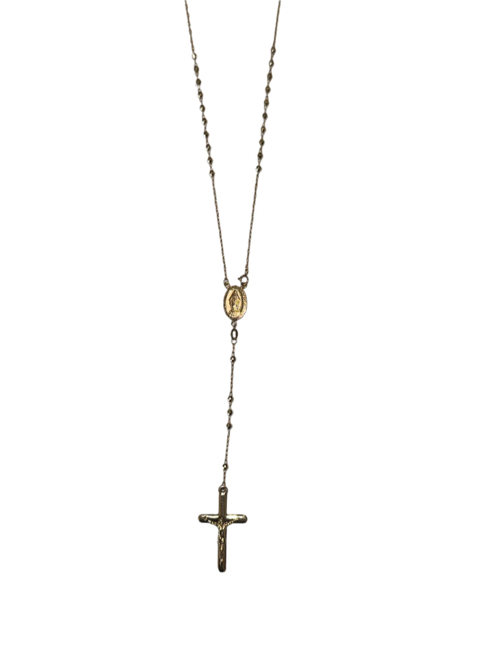 This all 14KT gold rosary features 2mm diamond cut gold beads and lies on a delicate rolo chain with a Miraculous medal center and crucifix. There is a subtle spring ring clasp at the side of the medal allowing it to be worn around the neck. When worn as a necklace the neck circumference measures 22".