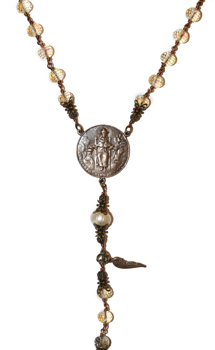 the beads are genuine high quality faceted Champagne Crystals with Antique glass Pearls from the Early 1900's. The centerpiece medallion is a double-sided design depicting Our Lady of Guadalupe and baby Jesus as Santo Nino de Atocha.