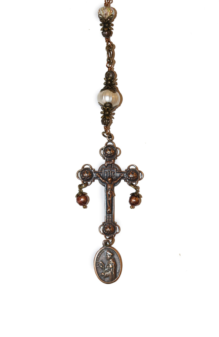 The crucifix details a rose at each end of the cross symbolic of our Blessed Mother Mary. Attached to the arms of the cross are two bronze Potato Pearls. Attached to the foot of the cross is a St. Medallion detailing St. Dominic.