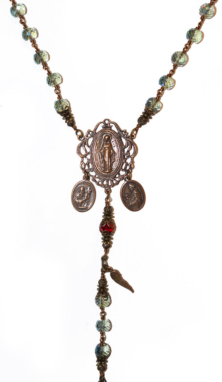 The beads are genuine high quality aqua crystals with garnet Swarovski crystals from Austria. The centerpiece medallion is an elaborate design depicting our lady of grace. Attached to the centerpiece are two medallions depicting St. Andrew and St. Dominic. The crucifix details roses and fleur-de-lys (lilies) designs on the cross. The rose is symbolic of our blessed mother Mary, while the fleur-de-lys symbolizes the holy trinity and the perpetual purity of our blessed mother Mary.