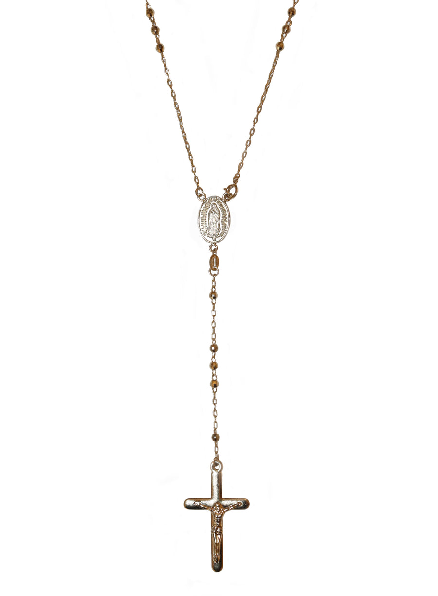 The crucifix details a Latin inscription that reads, "Resugram", which translates to, "I shall rise again." The two dangling medallions from the arms of the cross depict a Rose and a Fleur-de-Lys (Lilies). Both are symbolic of Our Blessed Mother Mary. The Fleur-de-Lys is also symbolic of the Holy Trinity.