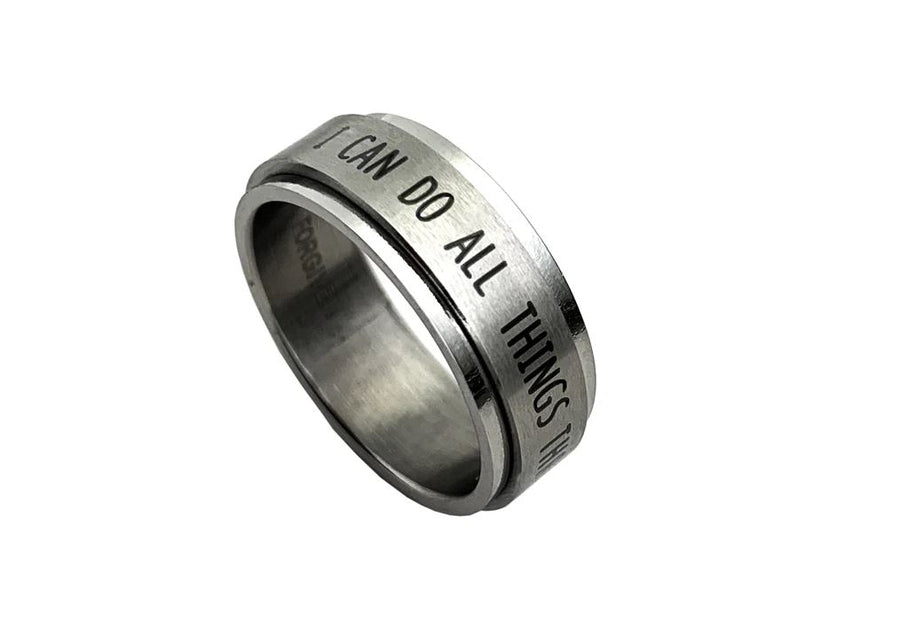 I Can Do All Things Spinner Ring is a Spinner Ring that is made from quality hypo allergenic stainless steel. This 1/4 inch wide spinning ring is actually two rings in one. The inner ring is on your finger and the outer ring spins around the inner ring. They do not come apart. (sometimes polishing material gets lodged between the two rings and a little soap and water or oil will dislodge the trapped material to regain the free spinning motion)