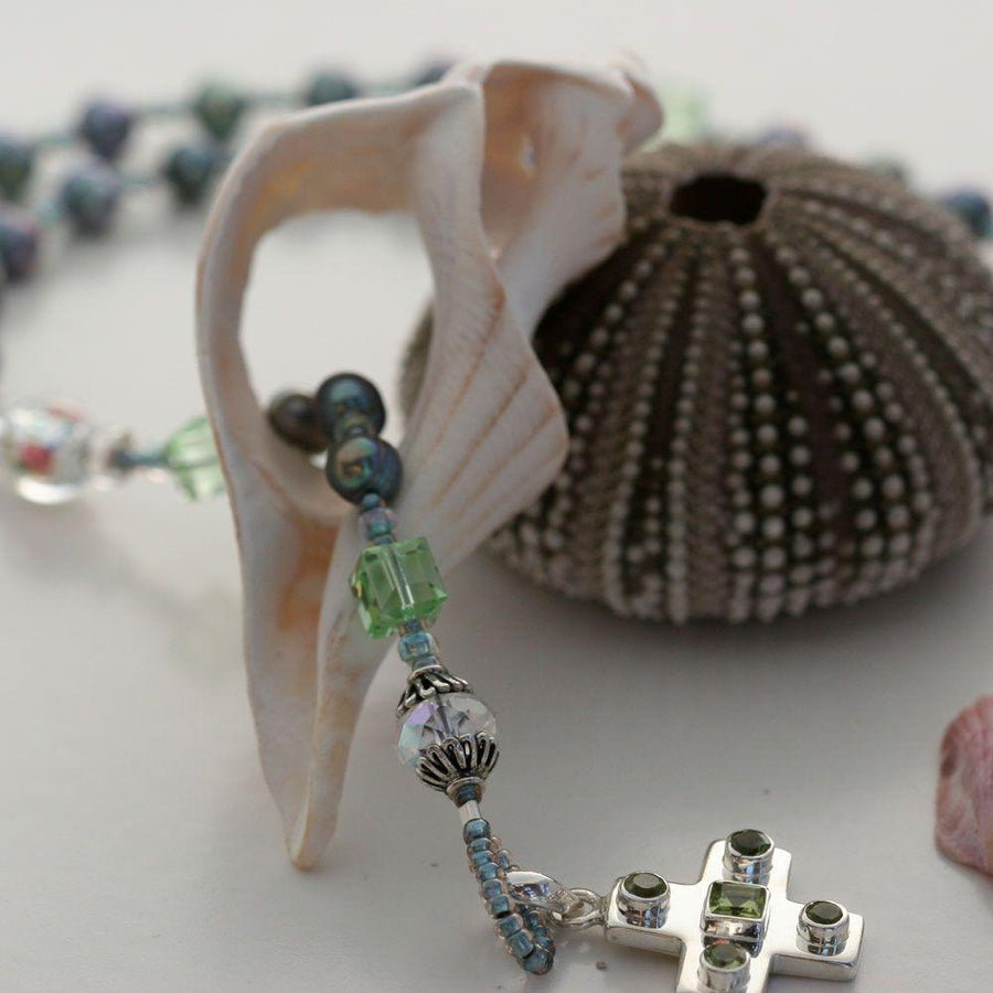 In this rosary, peacock pearls and Swarovski crystal evoke the colors of that night.