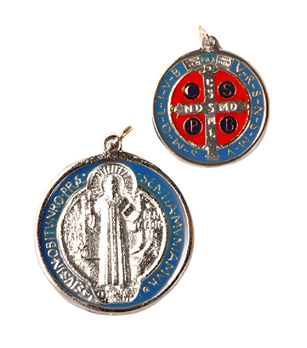 1" Oxidized Silver St. Benedict medal with red and blue enamel