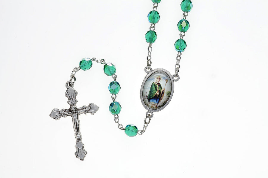 7mm Green Crystal St. Patrick Rosary with Prayer Card