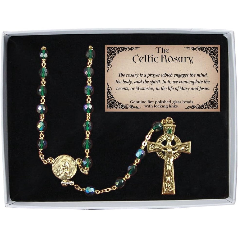 This rosary features 8mm green faceted glass beads on a gold tone chain. The center medal features St. Patrick. It comes gift boxed with a small card with bullet point instructions on how to pray the rosary.