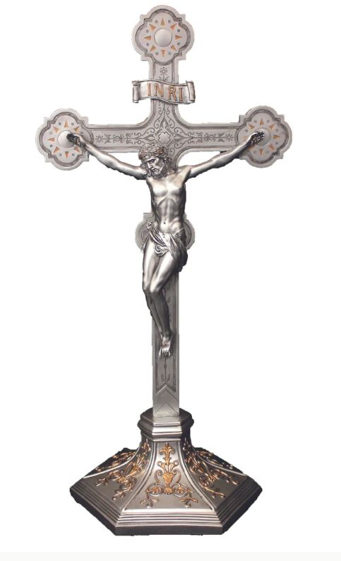 - Standing Ornate Crucifix in pewter style finish with gold highlights