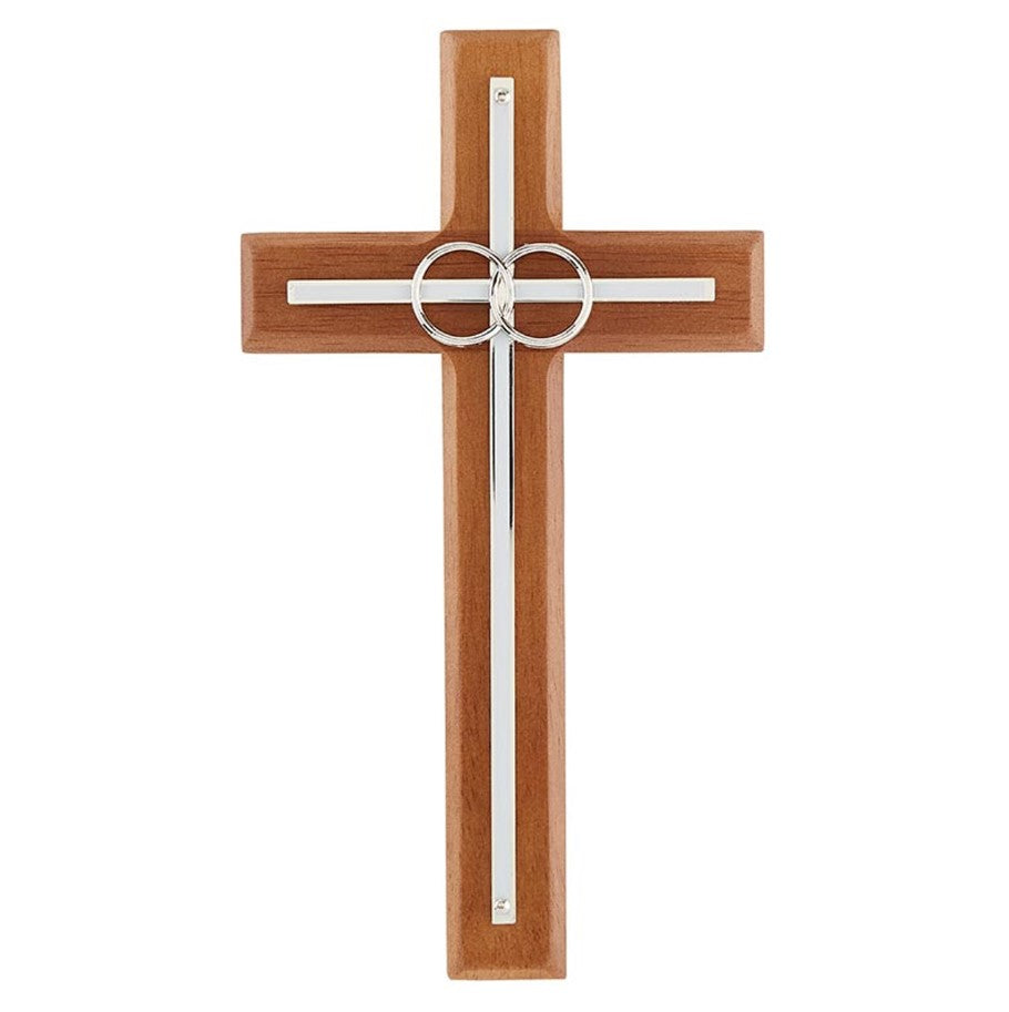 8" Walnut Overlay Wedding Wall Cross with Silver Rings