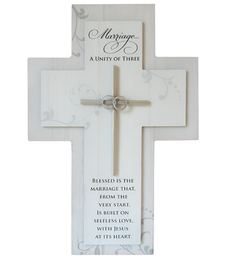 Made of sublimated MDF wood with metal cross and double rings accent. Ready to Hang.