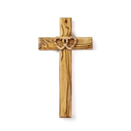 This high quality 8" Two Hearts Olive Wood Wall Cross is handcrafted out of genuine, natural olive wood from the Holy Land. It comes in a deluxe gift-ready box with a clear lid. Due to the natural variations in olive wood, each individual cross is completely unique.